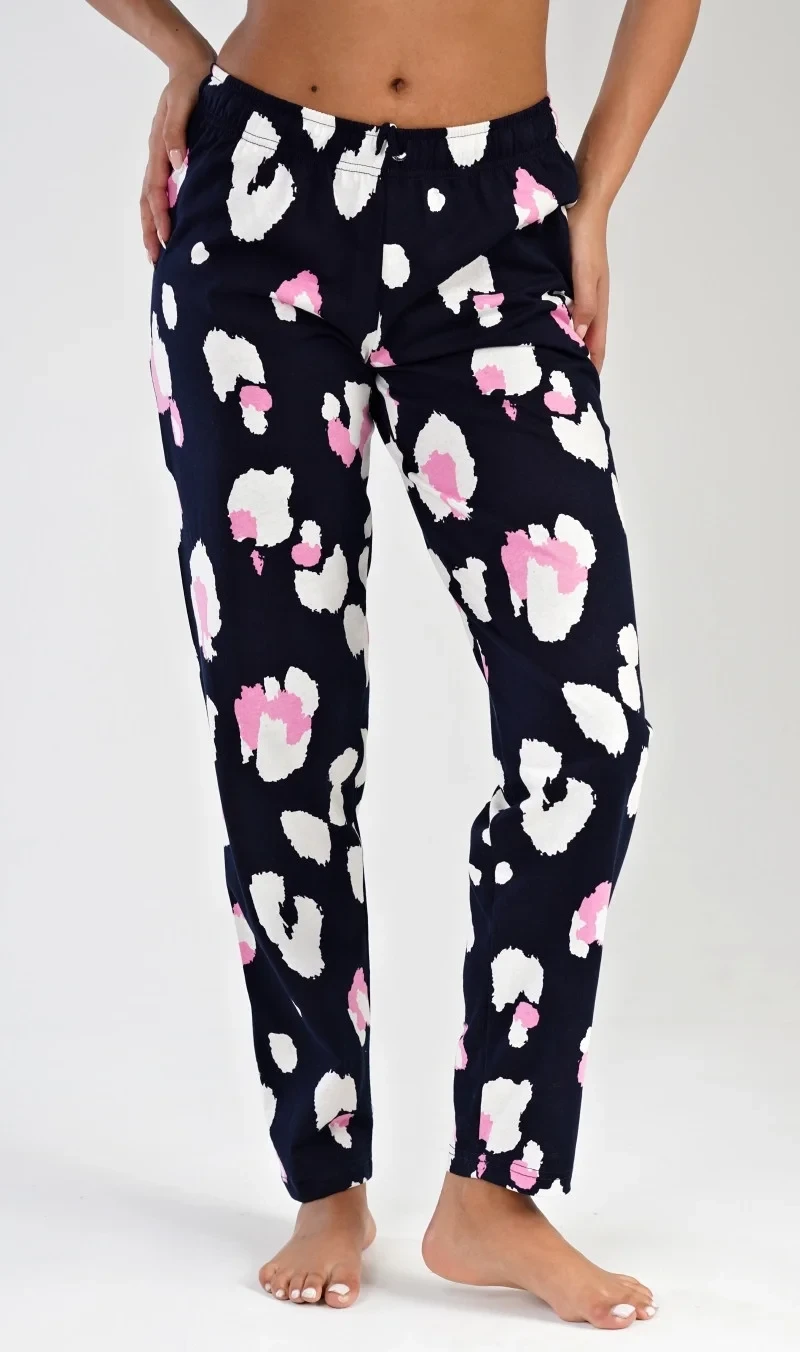Dámské bavlněné pyžamové kalhoty Jana. Dlouhé kalhoty jsou zdobeny barevnými skvrnami, které připomínají květy. Kalhoty jsou v pase do gumy a mají praktickou šňůrku na stažení, nemají kapsy. Použitý bavlněný materiál je příjemný a poddajný na dotek. Kalhoty jsou vhodné i na denní nošení.