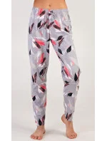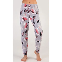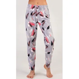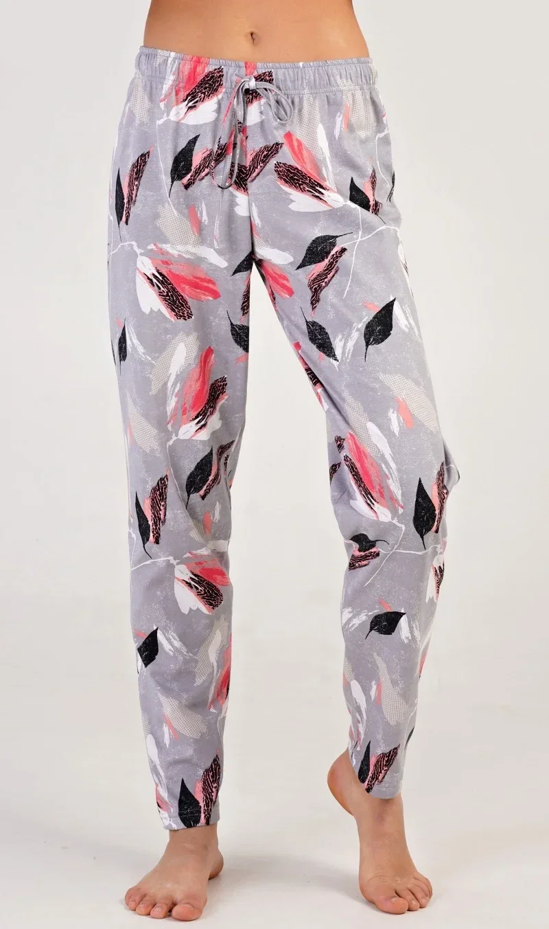 Dámské bavlněné pyžamové kalhoty Lucie. Dlouhé kalhoty jsou zdobeny barevnými listy na šedém podkladu. Kalhoty jsou v pase do gumy a mají praktickou šňůrku na stažení, nemají kapsy. Použitý bavlněný materiál je příjemný a poddajný na dotek. Kalhoty jsou vhodné i na denní nošení.