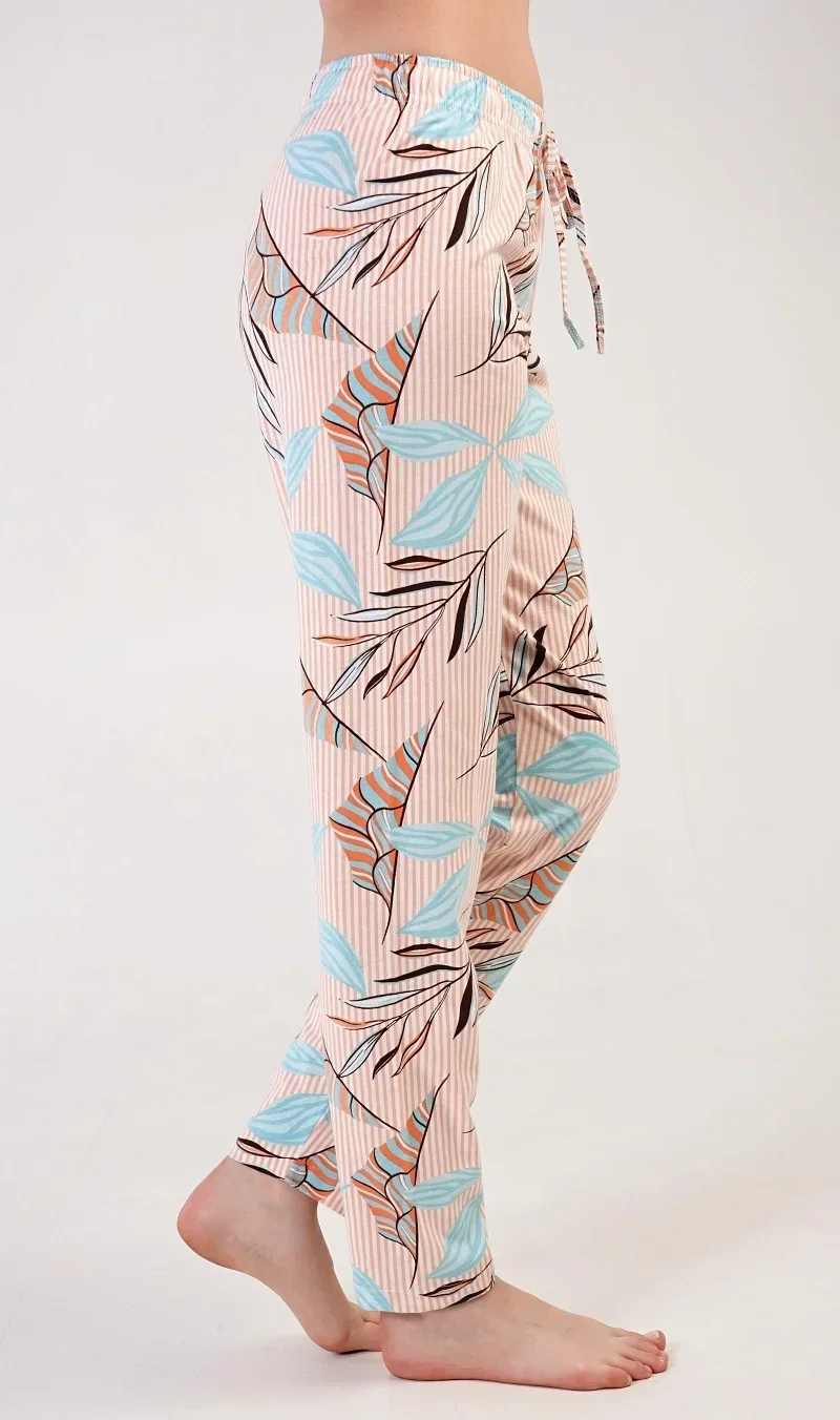 Dámské bavlněné pyžamové kalhoty Melissa. Máte doma pohodlné triko a potřebujete doplnit jen kalhoty? Pak je tento výrobek určený přesně pro Vás. Dlouhé kalhoty jsou zdobeny barevnými listy na proužkovaném podkladu. Jsou v pase do gumy a mají praktickou šňůrku na stažení, nemají kapsy. Použitý bavlněný materiál je příjemný a poddajný na dotek. Kalhoty jsou vhodné i na denní nošení.