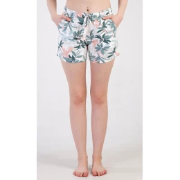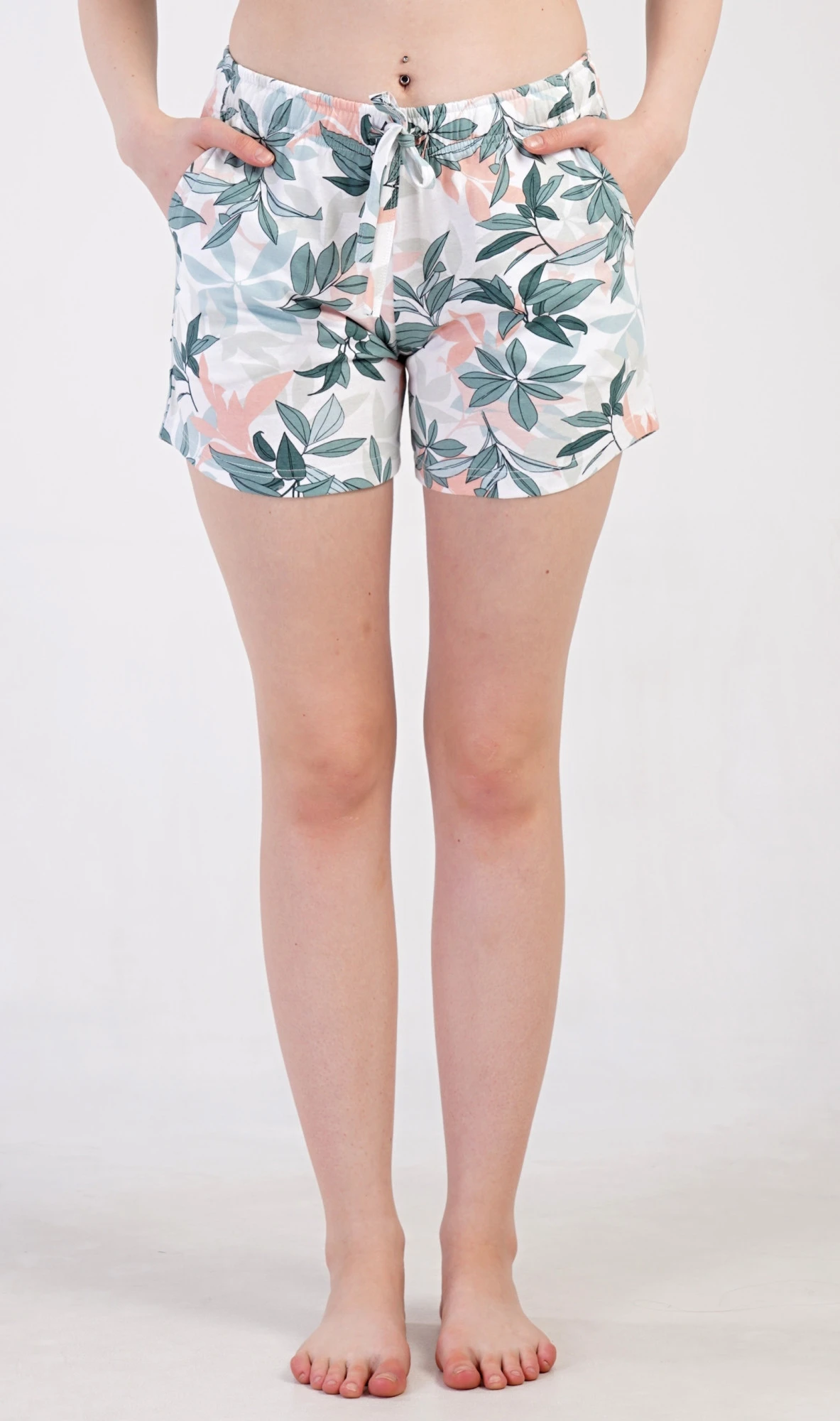 Dámské bavlněné pyžamové šortky Listy. Pyžamové krátké kalhoty jsou zdobeny potiskem listů. Mají v pase gumu, šňůrku na stažení a praktické kapsy. Použitý bavlněný materiál je příjemný a poddajný na dotek.
