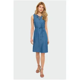 Šaty jsou vyrobeny z materiálu Lyocell příjemného na dotek. Jednoduchý, volný střih. Připojený pásek v pase, který zvýrazňuje siluetu. Výstřih s rozparkem a ozdobným vázáním. Modelka na fotografii měří 177 cm a nosí velikost 36.