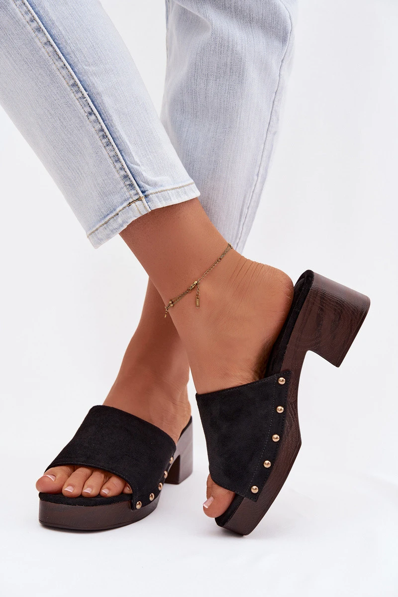 Dámské nazouváky vyrobené z ekologické semišové kůže jsou stylovým tipem pro ženy, které mají rády módní akcenty. Model na stabilním klockovém podpatku a platformě zaručuje pohodlí a jistotu kroku. Měkká vložka se stará o komfort nošení a zlaté nýty po stranách dodávají celku výrazný charakter. Tyto nazouváky se skvěle hodí jak do každodenních, tak i do elegantnějších letních outfitů. Při výběru velikosti se řiďte tabulkou velikostí.