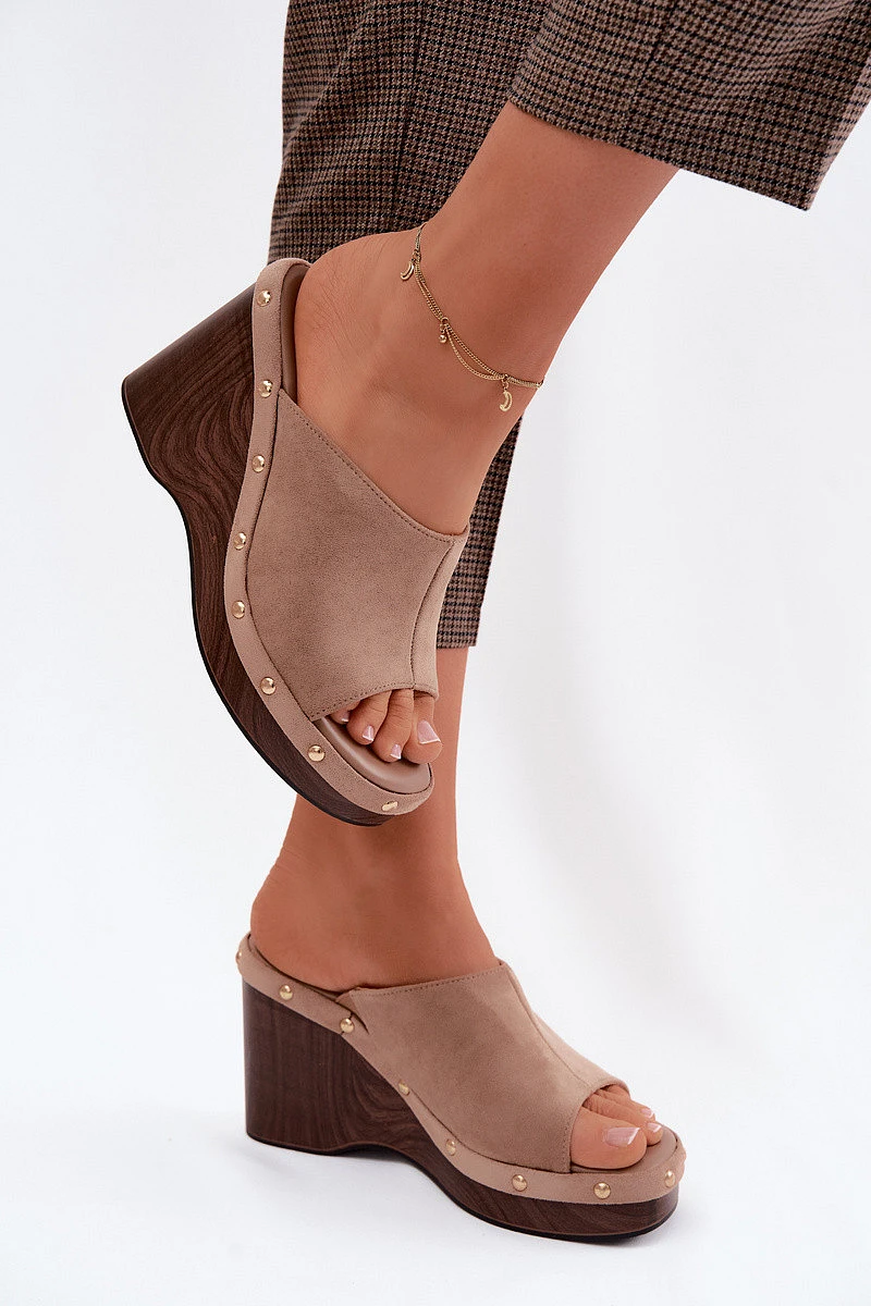 Stylové dámské pantofle vyrobené z eko semiše. Podpatek zajišťuje stabilitu a pohodlí při nošení, zároveň jemně zeštíhluje postavu. Zlaté nýty na bocích tvoří výrazný detail. Tento model se skvěle hodí do letních outfitů – jak s šaty, tak s každodenními kombinacemi. Ideální volba pro ženy, které ocení pohodlí spojené s výrazným, stylovým akcentem. Při výběru velikosti se řiďte tabulkou velikostí.