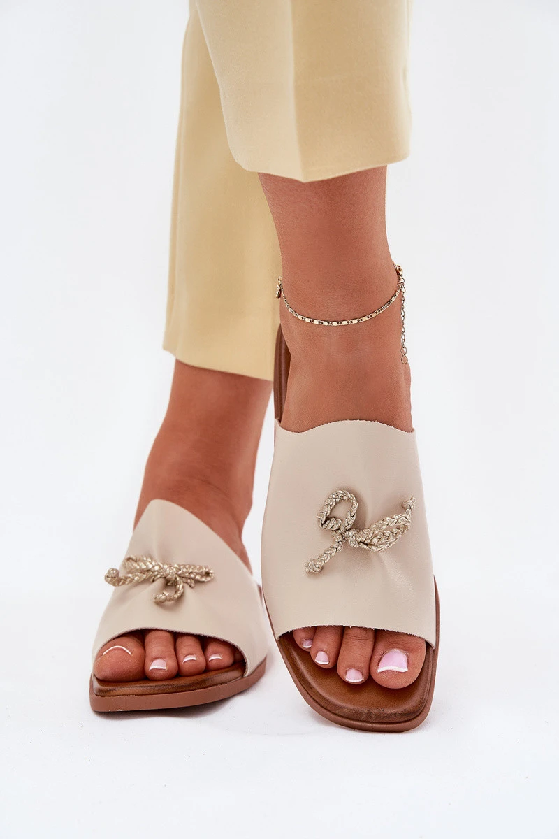 Dámské pantofle z eko kůže, usazené na plochém podpatku, jsou elegantním návrhem na teplé dny. Tento model se vyznačuje jemným ozdobným vázáním, které jim dodává výjimečný charakter. Jejich klasický střih zajišťuje, že se skvěle hodí jak k šatům, tak k látkovým kalhotám, čímž vytvářejí stylový a pohodlný vzhled. Při výběru velikosti se řiďte tabulkou velikostí.