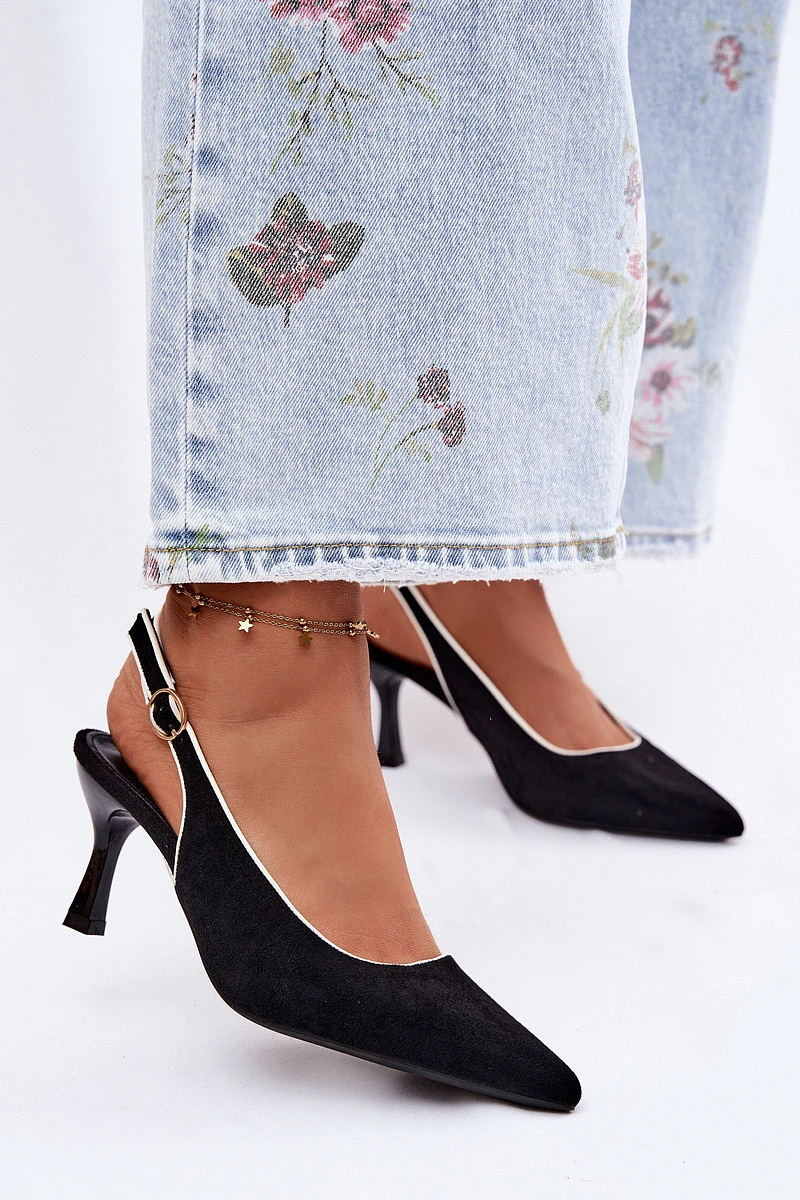 Dámské sandály z eko semiše jsou elegantní volbou pro ženy, které ocení styl a ženský charakter. Model se vyznačuje špičatými nosky, které opticky zeštíhlují nohu. Vrchní část je zakončena eko koženou lemovkou, která zdůrazňuje estetiku obuvi a dodává jí dokonalý vzhled. Tenký podpatek typu jehla krásně tvaruje siluetu, prodlužuje nohy a dodává lehkost každému outfitu. Zapínání na přezku s nastavitelným páskem umožňuje perfektní přizpůsobení noze a zajišťuje pohodlí při nošení. Ideální volba na elegantní vycházky, slavnostní příležitosti a večerní události. Při výběru velikosti se řiďte tabulkou velikostí.