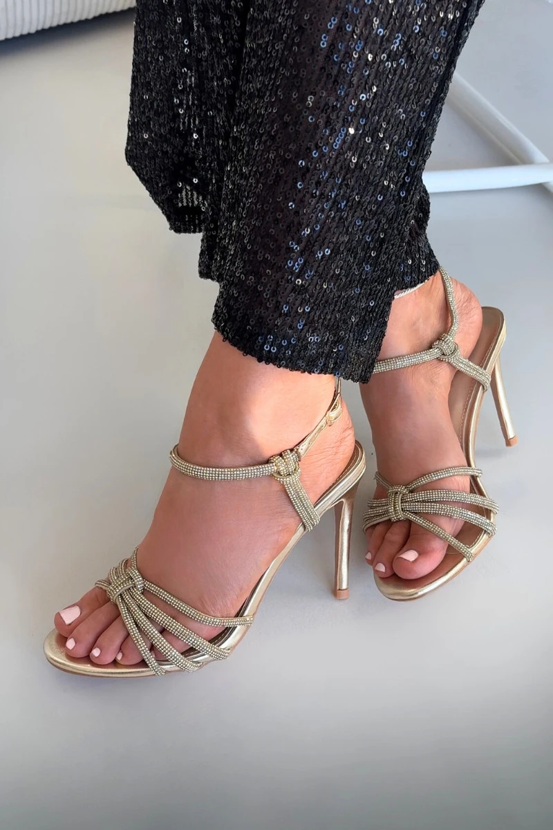 Luxusní zlaté sandály Tanelle na vysokém podpatku s jemnými pásky a třpytivými cyrkoniemi jsou ideální volbou pro slavnostní příležitosti. Elegantní provedení krásně zvýrazní nohy, zatímco vysoký podpatek dodá siluetě lehkost a ženskost. Třpytivé detaily dodávají obuvi exkluzivní vzhled.