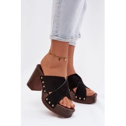 Dámské pantofle na podpatku typu sloupek a platforma jsou návrhem pro ženy, které mají rády výrazné detaily. Pásky vyrobené z eko semiše. Zlaté cvočky tvoří módní, poutavý akcent. Stabilní sloupek v kombinaci s platformou zajišťuje pohodlí při nošení a jistotu kroku, přičemž zdůrazňuje siluetu. Tento model se skvěle hodí do letních stylizací – jak na běžné nošení, tak na večerní výlety. Při výběru velikosti se řiďte tabulkou velikostí.