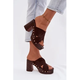 Dámské pantofle na podpatku typu sloupek a platforma jsou návrhem pro ženy, které mají rády výrazné detaily. Pásky vyrobené z eko semiše. Zlaté cvočky tvoří módní, poutavý akcent. Stabilní sloupek v kombinaci s platformou zajišťuje pohodlí při nošení a jistotu kroku, přičemž zdůrazňuje siluetu. Tento model se skvěle hodí do letních stylizací – jak na běžné nošení, tak na večerní výlety. Při výběru velikosti se řiďte tabulkou velikostí.