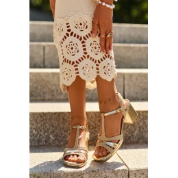 Dámské sandály vyrobené z ekologické kůže. Usazené na podpatku ve formě sloupku. Zapínají se na nastavitelný řemínek se sponou, zaručující ideální přizpůsobení noze. Vpředu jsou dva pásky, jeden z nich je navíc lemován lesklou nití, dodávající jim jemný lesk. Tyto sandály budou skvělým doplňkem každé letní stylizace! Při výběru velikosti se řiďte tabulkou velikostí.