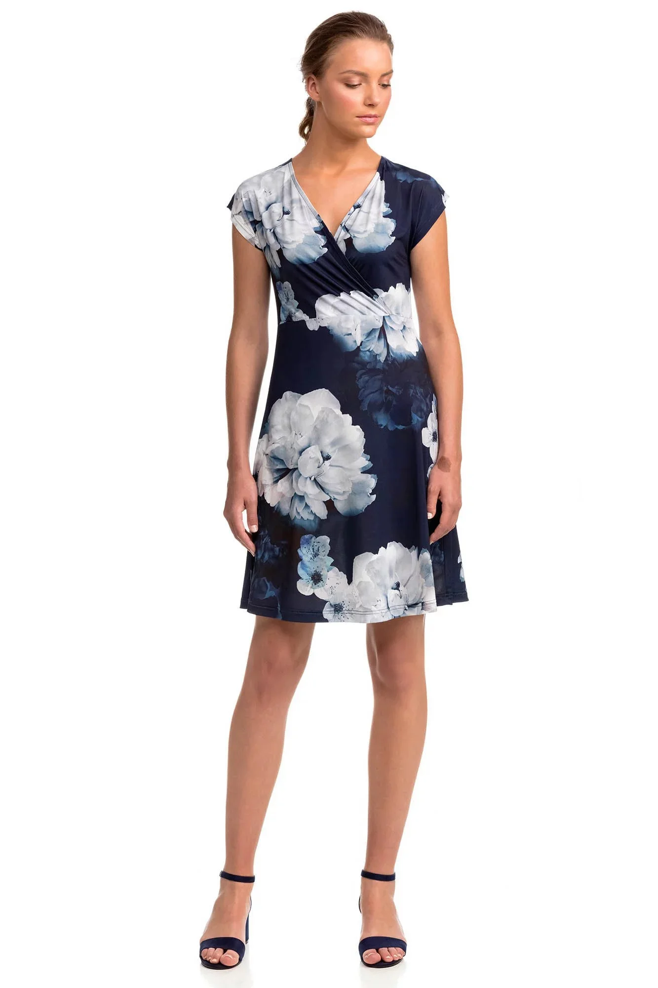 Elegantní dámské květované šaty s krátkým rukávem a překládaným výstřihem do V. Šaty jsou vyrobené z příjemného jersey-polyesteru s příměsí elastanu, které poskytují lehkost, prodyšnost, pružnost i odolnost.