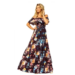 Dámské šaty 194-3 NUMOCO - příjemný lehký elastický materiál - s odhalenými rameny, páskem a rozparkem - velké barevné květy na černém podkladu - výborně se hodí na léto