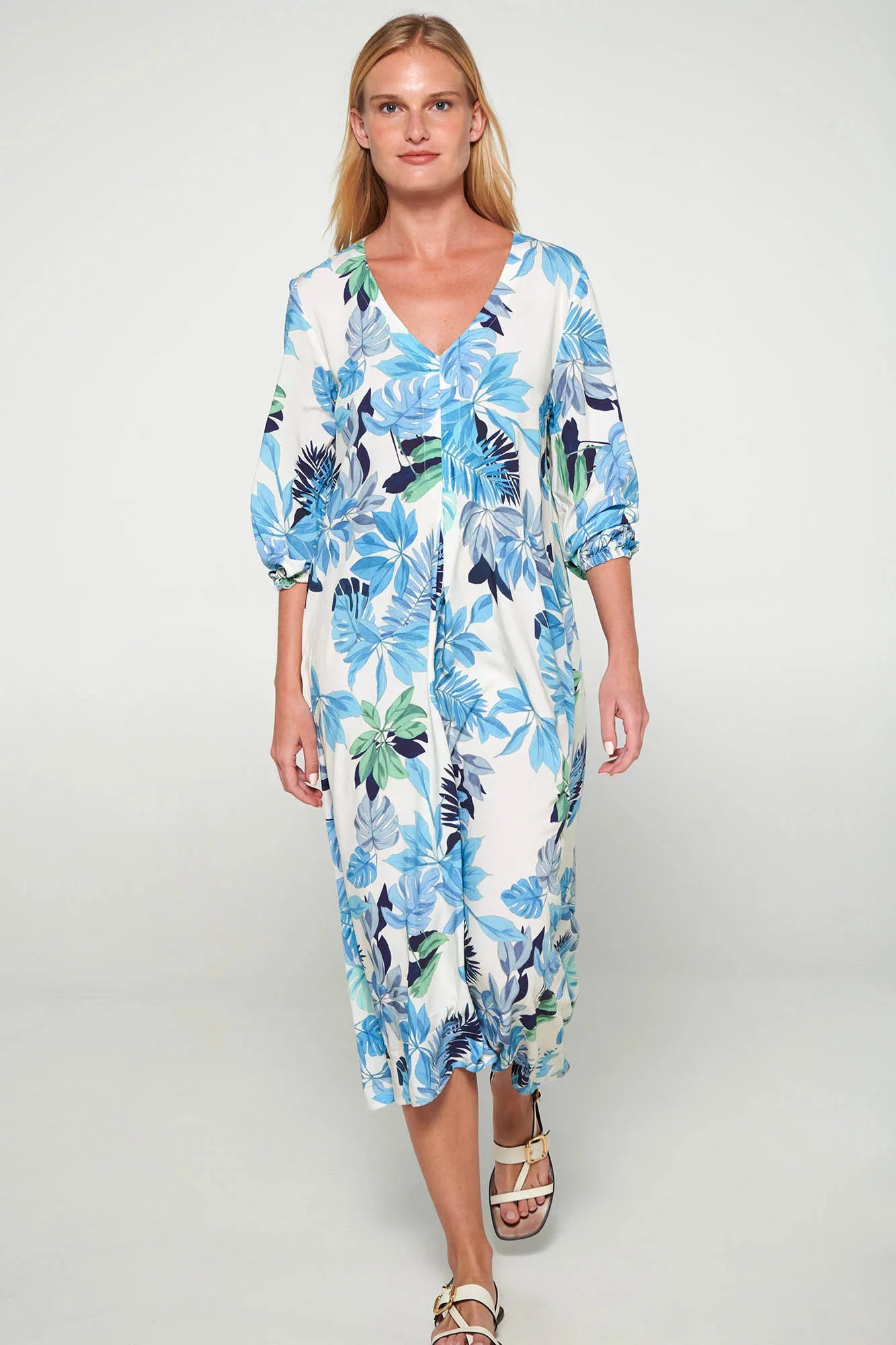 Dlouhý kaftan s krátkými rukávy, výstřihem do V a záhyby pro větší pohodlí. Krásný, zářivý květinový vzor, který můžete nosit celé léto.