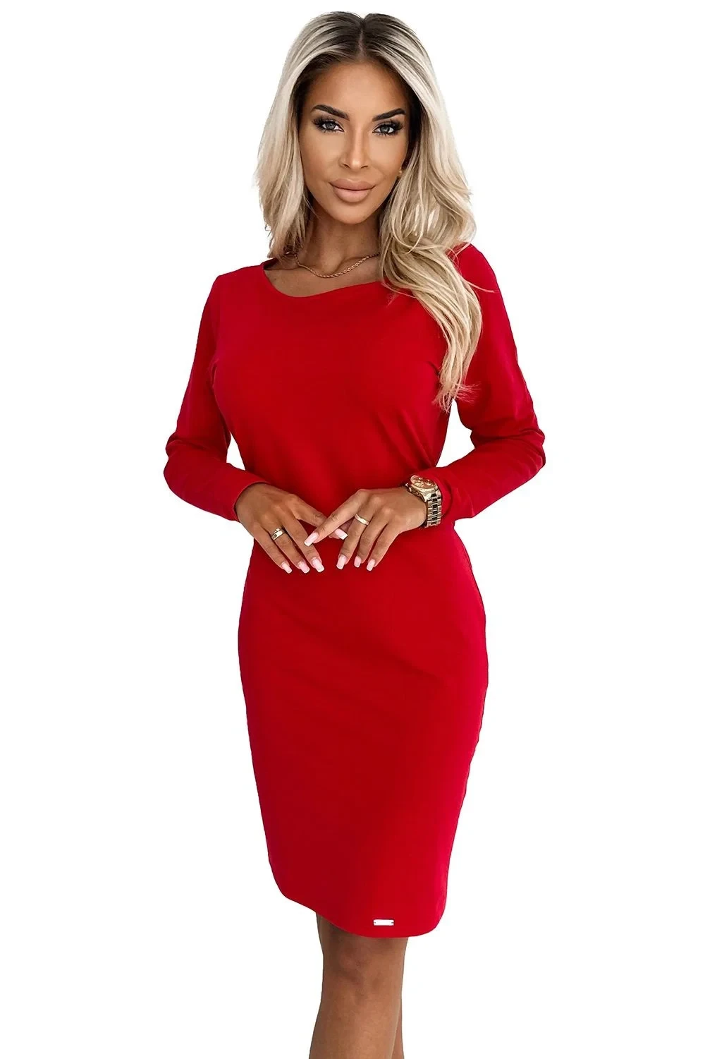 Dámské šaty 209-12 NUMOCO - červená barva - z vysoce jakostní bavlny - dlouhé rukávy - široký pásek - délka sukně ke kolenům