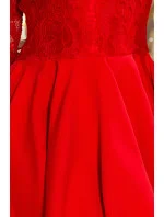 Dámské šaty 210-6 NICOLLE NUMOCO - červená barva - asymetrický střih - tříčtvrteční rukávy - hluboký výstřih lemovaný krajkou - zadní strana sukně je prodloužená