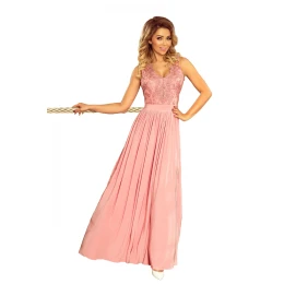 Elegantní dámské šaty 215-3 Numoco - dlouhá skládaná sukně s rozparkem - horní část bez rukávů s výšivkou - odhalená záda