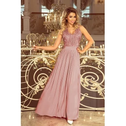 Dámské šaty 215-5 LEA NUMOCO - starorůžová barva - dlouhá skládaná sukně s rozparkem - horní část bez rukávů s výšivkou - odhalená záda