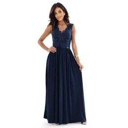 Dámské šaty 215-6 LEA NUMOCO - tmavě modrá barva - dlouhá skládaná sukně s rozparkem - horní část bez rukávů s výšivkou - odhalená záda