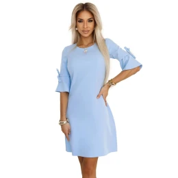 Dámské šaty 217-11 NEVA NUMOCO - světle modrá barva - z příjemného materiálu - tříčtvrteční rukávy - zakončené volánky a mašličkami - délka sukně ke kolenům