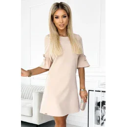 Dámské šaty 217-7 Neva NUMOCO - béžová barva - z příjemného materiálu - tříčtvrteční rukávy - zakončené volánky a mašličkami - délka sukně ke kolenům