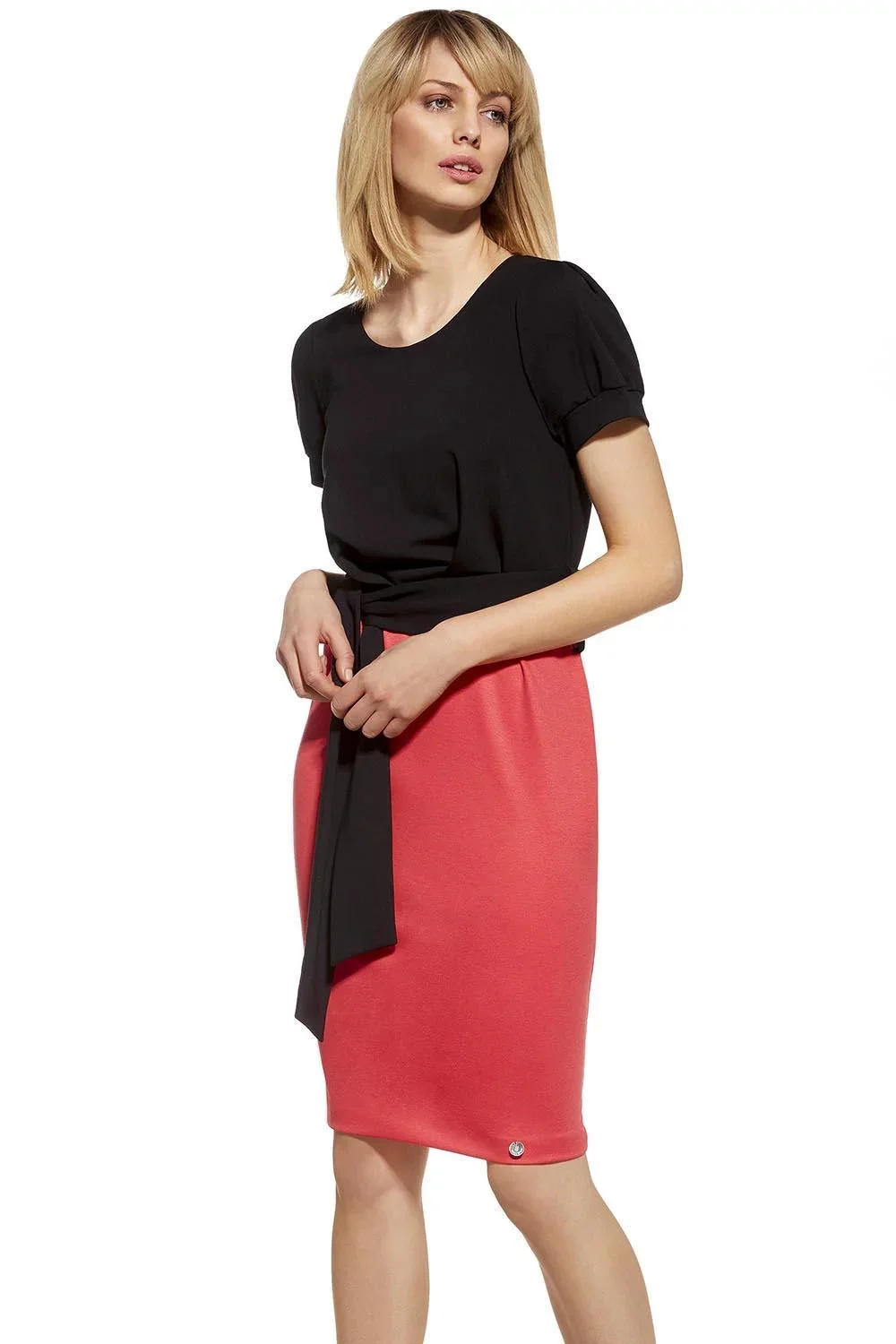 Šaty v krásném módním barevném provedení.Horní část modelu je ve přední části ozdobená černými záložkami. Šaty mají vypasovanou tužkovou spodní část v korálové barvě. Pas je zvýrazněný širokým páskem, který je možné zavázat vpředu nebo na boku. Model má krátké rukávy, kulatý výstřih a vzadu se zapíná na skrytý zip. Délka je midi.Šaty jsou polským produktem a jsou vyrobené z velmi kvalitního, lehce pružného hladkého materiálu.