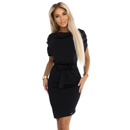Dámské šaty 240-8 ROXI NUMOCO - černá barva - krátké rukávy - asymetrická sukně - pásek na zavazování - délka šatů sahá ke kolenům