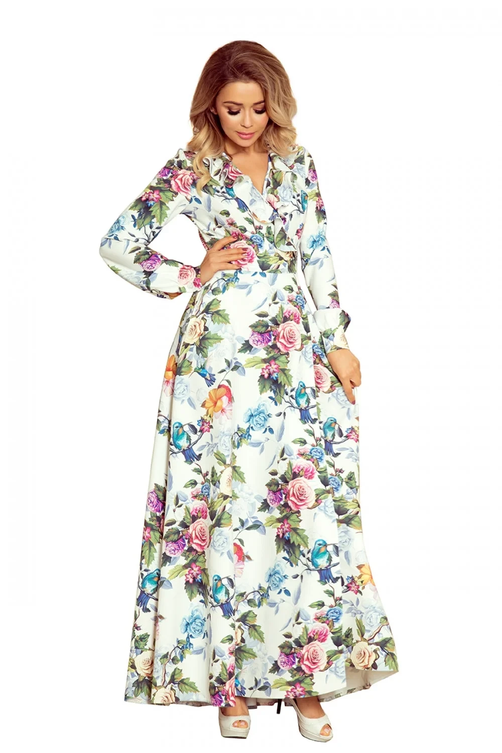 Dlouhé šaty 245-1 Numoco - květinový vzor - výstřih ve tvaru V s volánem - dlouhé rukávy - dlouhá sukně