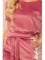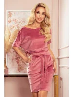 Dámské šaty 249-4 NUMOCO - starorůžová barva - s krátkými rukávy - se zavazováním v pase - na bocích kapsy