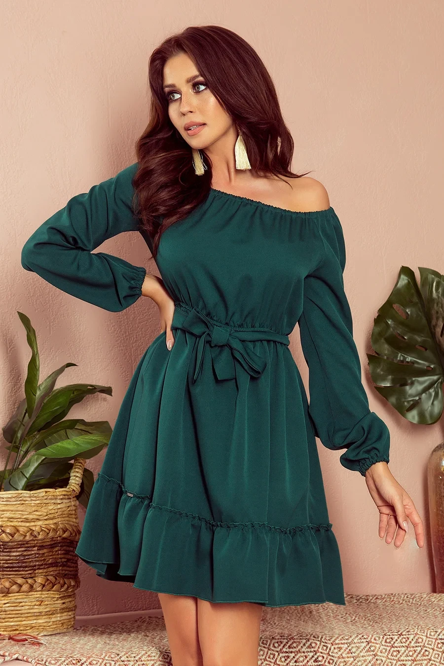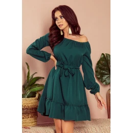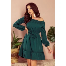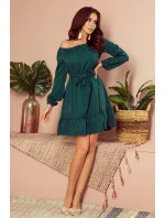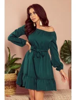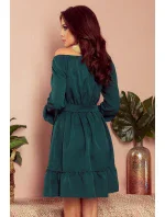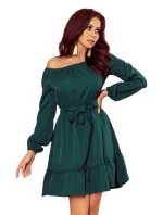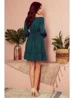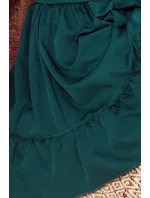 Dámské šaty 265-1 Daisy Numoco - lahvově zelená barva - volnějšího střihu - dlouhé nadýchané rukávy - na ramenou,v pase a na rukávech je našita elastická páska - s volánky - vázání v pase