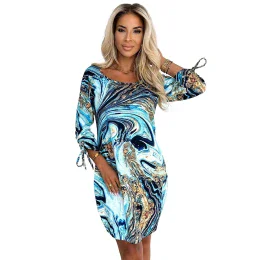 Dámské šaty 281-7 SOPHIE NUMOCO - modrá barva - kulatý výstřih - módní vzor novin - tříčtvrteční rukávy ozdobené vázáním - s kapsami - z příjemného, na dotek teplého materiálu - bez pásku