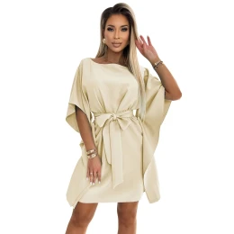 Dámské šaty 287-28 SOFIA NUMOCO - béžová barva - volnějšího střihu "motýl" - tříčtvrteční rukávy - v pase na zavazování - délka ke kolenům