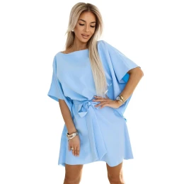 Dámské šaty 287-36 SOFIA NUMOCO - světle modrá barva - volnějšího střihu "motýl" - tříčtvrteční rukávy - v pase na zavazování - délka ke kolenům