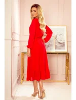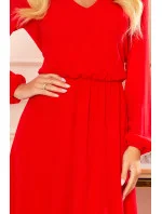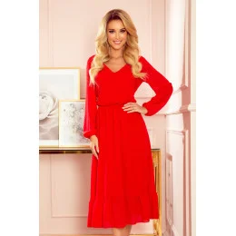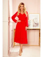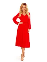 Dámské šaty 304-3 NUMOCO - červená barva - výstřih do tvaru "V" - s dlouhými šifónovými rukávy - spodní okraj zakončený šifónovým volánkem