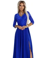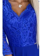 Dámské šaty 309-12 AMBER NUMOCO - královská modrá barva - elegantní střih - tříčtvrteční rukávy - krajkové šaty s výstřihem - s rozparkem