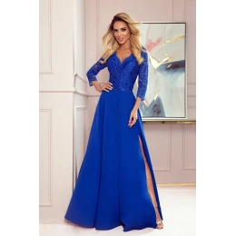 Dámské šaty 309-2 Amber NUMOCO - královská modrá barva - elegantní střih - tříčtvrteční rukávy - krajkové šaty s výstřihem - s rozparkem