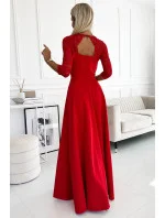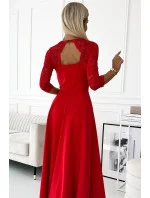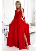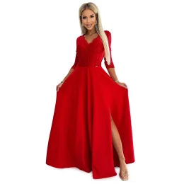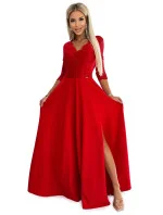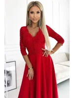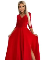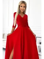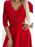 Dámské šaty 309-8 AMBER NUMOCO - červená barva - elegantní střih - tříčtvrteční rukávy - krajkové šaty s výstřihem - s rozparkem