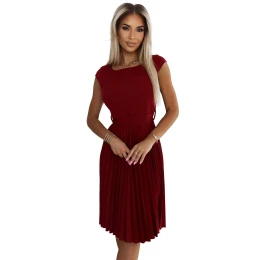 Dámské šaty 311-15 LILA NUMOCO - bordó barva - řasený střih - krátké rukávy - délka sukně nad kolena - kapsy - zavazování na pásek s velkou mašlí - zapínání vzadu na skrytý zip