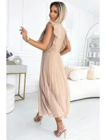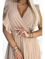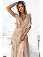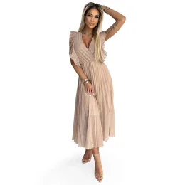 Dámské šaty 315-6 EMILY NUMOCO - béžová barva - řasený střih - krátké rukávy - výstřih ve tvaru "V" - délka 7/8 - zapínání vzadu na skrytý zip