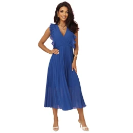 Dámské šaty 315-8 EMILY NUMOCO - královská modrá barva - řasený střih - krátké rukávy - výstřih ve tvaru "V" - délka 7/8 - zapínání vzadu na skrytý zip