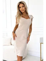 Dámské šaty 318-6 NUMOCO - béžová barva - krásně řešený dekolt - krátké rukávy - délka sukně ke kolenům - střih zvýrazňující ženskou postavu