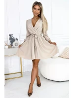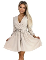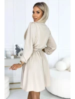 Dámské šaty 339-4 BINDY NUMOCO - béžová barva - zavinovací výstřih do V - dlouhé rukávy - v pase zdobené stuhou - délka sukně ke kolenům