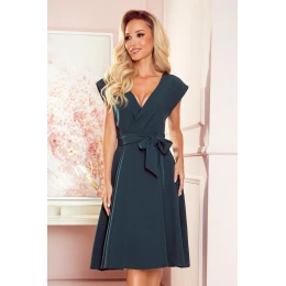 Dámské šaty 348-2 SCARLETT NUMOCO - zelená barva - překřížený a nařasený dekolt - krátké rukávy - v pase zavazování na pásek - rozšířená a nařasená sukně