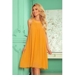 Dámské šaty 350-3 ALIZEE NUMOCO - medová barva - z šifónového materiálu - s vázáním kolem krku a na zádech - bez rukávů - zavazování kolem pasu - délka nad kolena - dole rozšířená