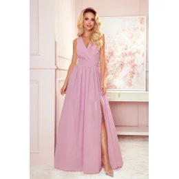 Dámské šaty 362-3 Justine NUMOCO - starorůžová barva - ze vzdušného materiálu v pudrově růžové barvě s brokátem - široká ramínka - psaníčkový výstřih - zapínání vzadu na skrytý zip - zavazování za krkem - s rozparkem