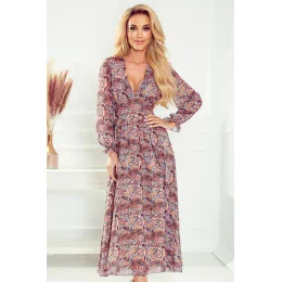 Dámské šaty 378-1 NUMOCO - světle hnědá barva - styl BOHO - exponovaný dekolt - dlouhé rukávy - z příjemného lehkého materiálu - délka ke kotníkům
