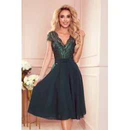 Dámské šaty 381-2 LINDA NUMOCO - zelená barva - šifónové šaty - krajkový dekolt - krátké rukávy - nabíraná sukně