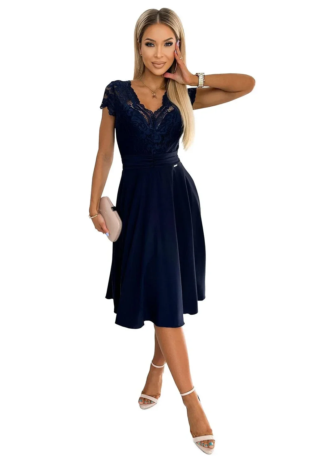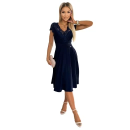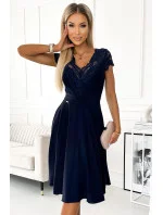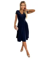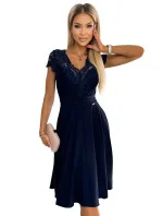 Dámské šaty 381-4 LINDA NUMOCO - tmavě modrá barva - šifónové šaty - krajkový dekolt - krátké rukávy - nabíraná sukně