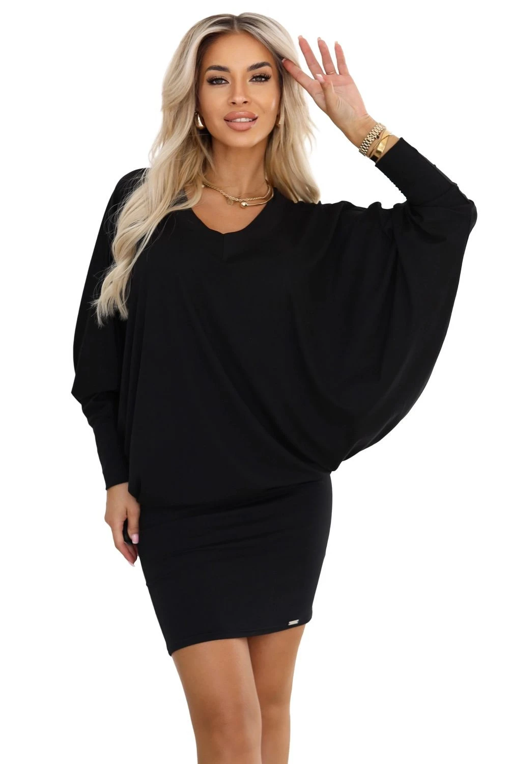 Dámské šaty 402-10 NUMOCO - černá barva - sexy dámské netopýří šaty - dlouhé rukávy - z elastického materiálu s brokátem - délka nad kolena