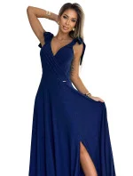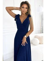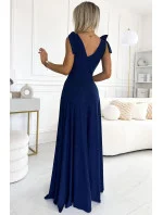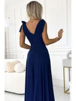 Dámské šaty 405-5 ELENA NUMOCO - tmavě modrá barva - z příjemného materiálu - dlouhé šaty s dekoltem - bez rukávů - ramena ozdobená mašličkami - hluboký výstřih ozdobený řasením - dlouhý rozparek