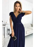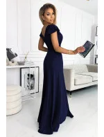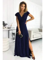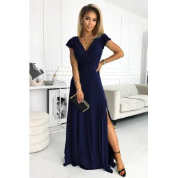 Originální dámské šaty 411-3 CRYSTAL Numoco - dlouhé šaty s dekoltem - krátké rukávky zakončené volánky - hluboký výstřih ozdobený překřížením - dlouhý rozparek - délka až na zem - vhodné na plesy - zapínání vzadu na skrytý zip