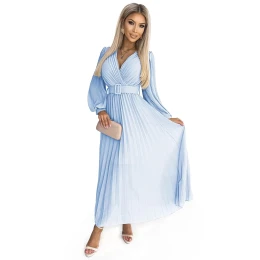 Dámské šaty 414-10 KLARA Numoco basic - modrá barva - řasené šaty z šifónu - překřížený dekolt - dlouhé rukávy